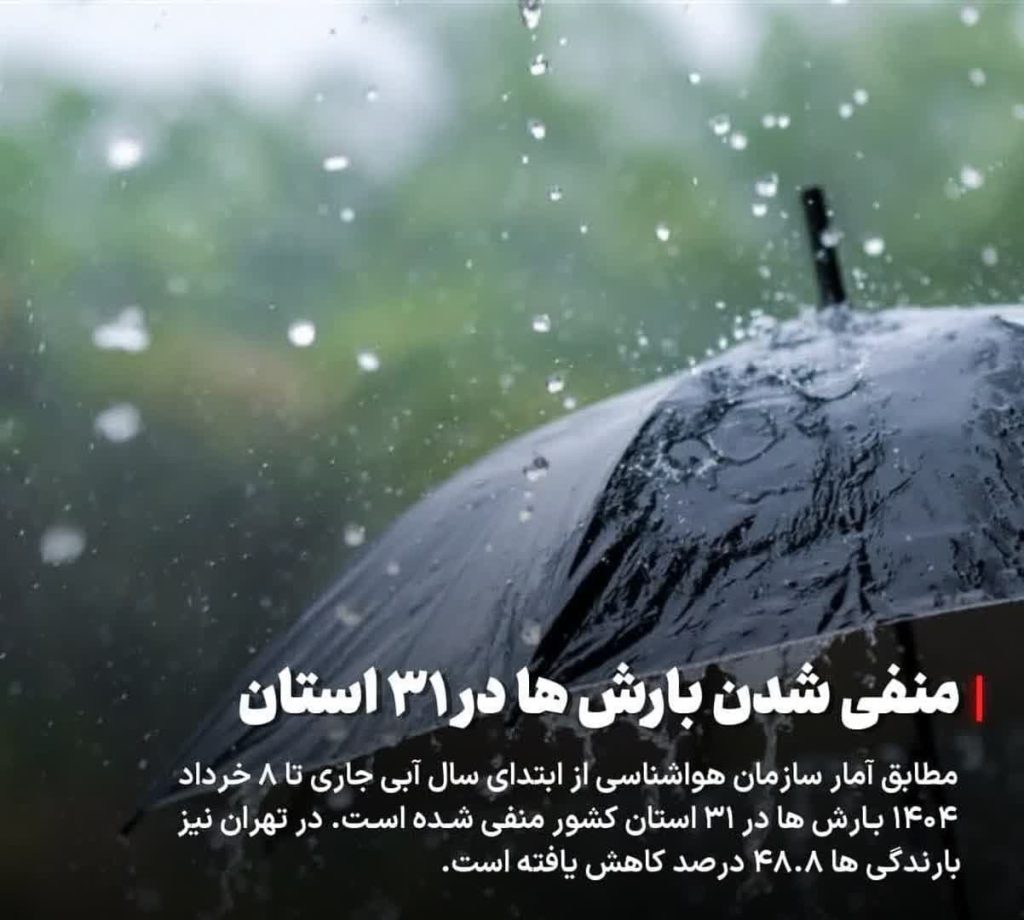 مطابق آمار سازمان هواشناسی از ابتدای سال آبی جاری تا ۸ خرداد ۱۴۰۴ بارشها در ۳۱ استان کشور منفی شده است. در تهران نیز بارندگیها ۴۸.۸ درصد کاهش یافته است.
