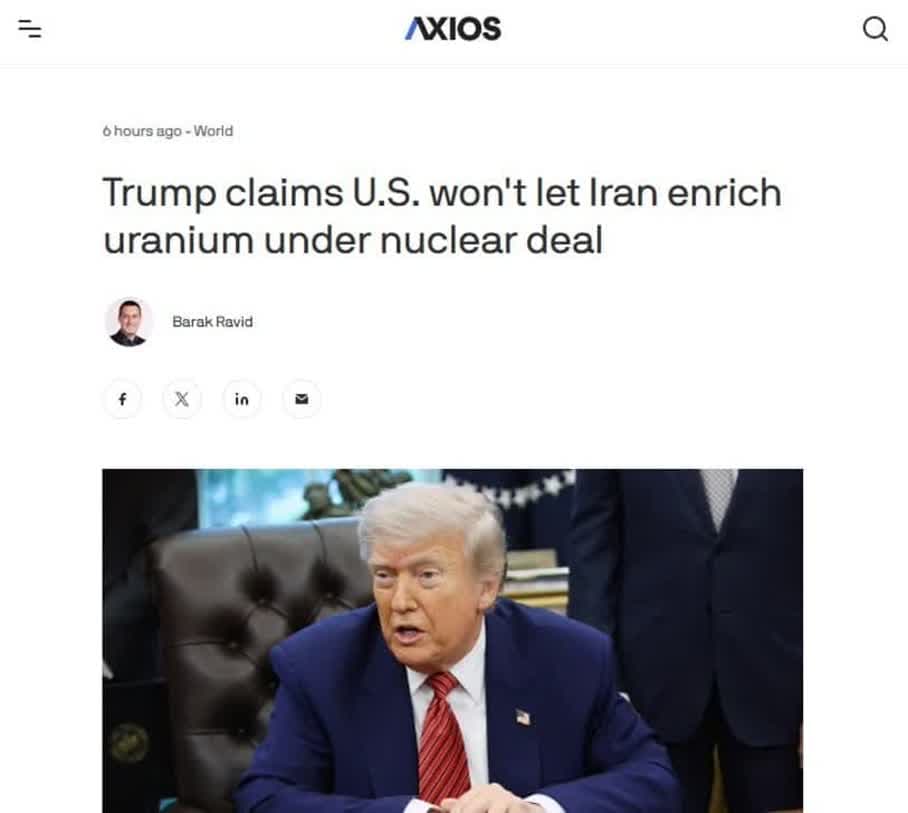 🔹 ترامپ روز دوشنبه گفته که ایالات متحده تحت یک توافق هستهای احتمالی، به ایران اجازه غنیسازی اورانیوم نخواهد داد.