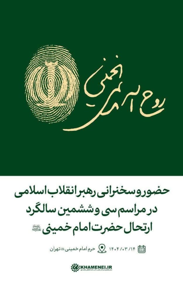🔹 مراسم سیوششمین سالگرد رحلت حضرت امام خمینی رحمةاللهعلیه با حضور و سخنرانی حضرت آیتالله العظمی خامنهای رهبر معظم انقلاب اسلامی برگزار میشود.