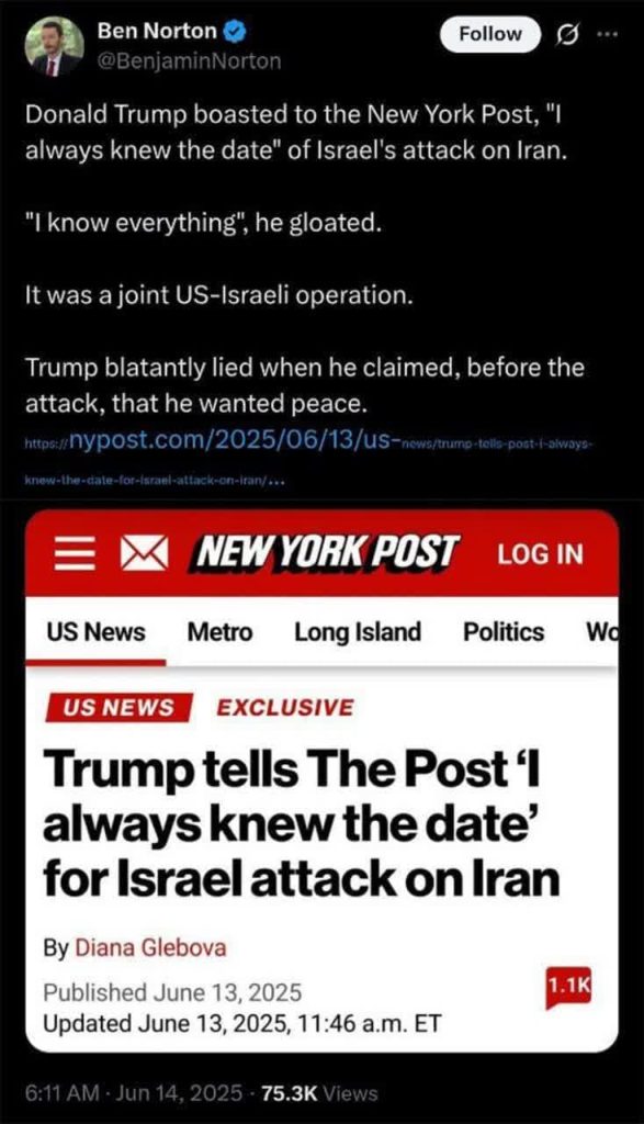 🔹دونالد ترامپ در مصاحبه با نیویورک پست با افتخار گفت: «من همیشه، تاریخ حمله اسرائیل به ایران را میدانستم.»