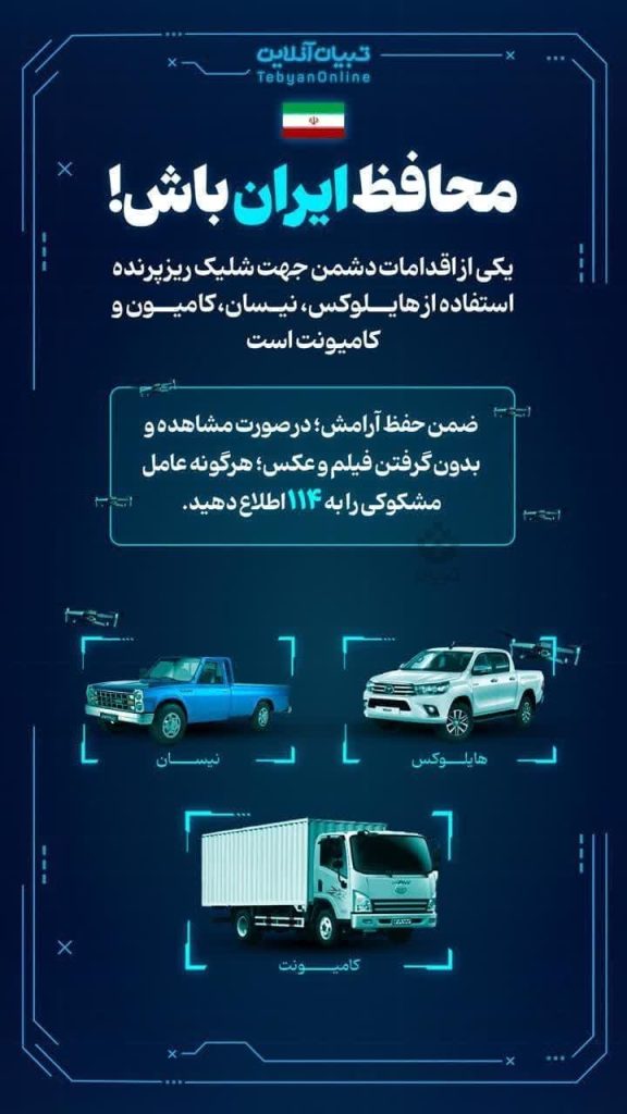 🔹یکی از اقدامات دشمن جهت شلیک ریزپرنده استفاده از هایلوکس، نیسان، کامیون و کامیونت است.