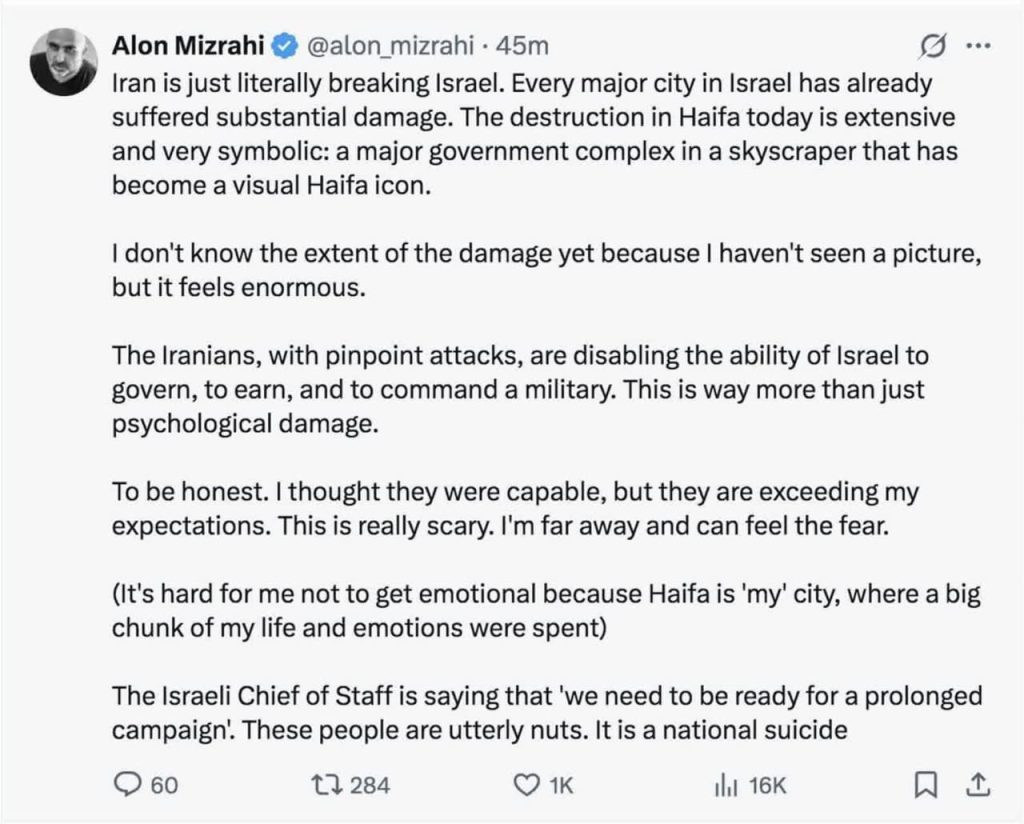 🔹ایران به معنای واقعی کلمه در حال نابودی اسرائیل است. هر شهر بزرگ اسرائیل تاکنون خسارات قابل توجهی متحمل شده است. تخریب امروز در حیفا گسترده و بسیار نمادین است: یک مجتمع دولتی بزرگ در یک آسمان خراش که به یک نماد بصری حیفا تبدیل شده است.