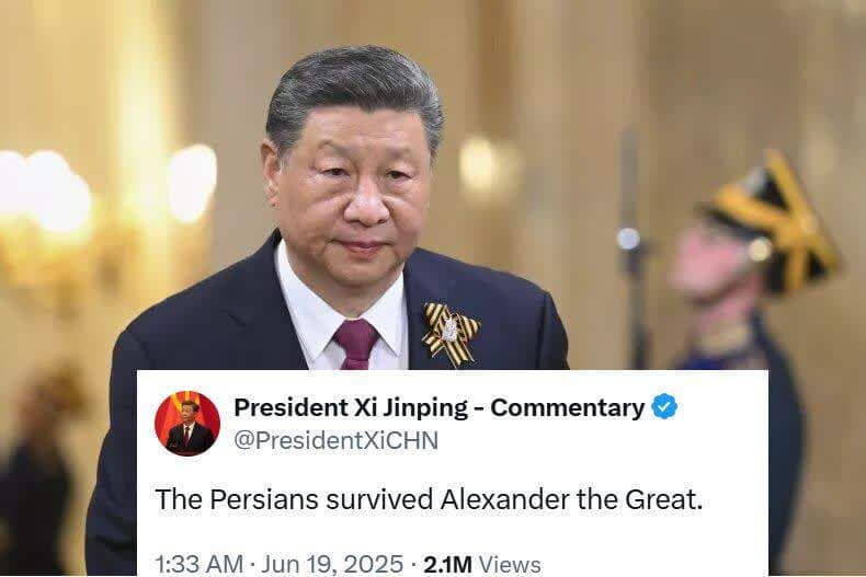 🔹با شروع اقدامات نظامی و تروریستی رژیم صهیونیستی در خاک ایران از روز جمعه ۲۳ خرداد ماه، دولت چین در این هفته با کارزاری دیپلماتیک، برای توقف جنایات اسرائیل تلاش کرده و رئیس جمهوری چین با انتشار پیامی، تابآوری تاریخی ایرانیان را یادآوری کرد.