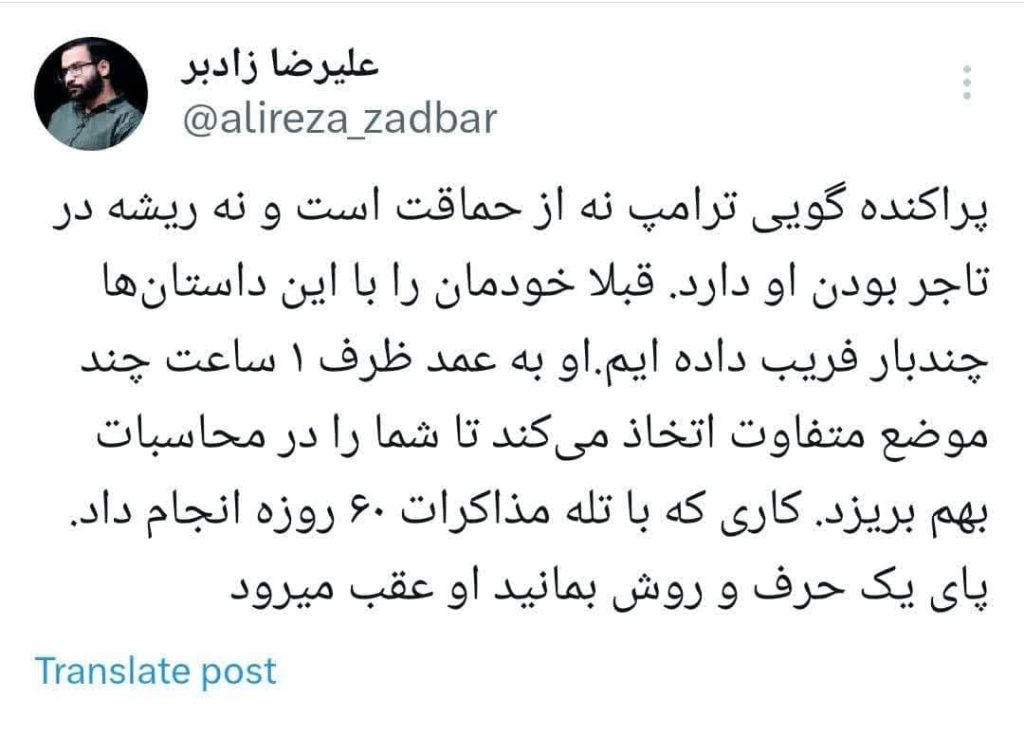 پراکنده گویی ترامپ نه از حماقت است و نه ریشه در تاجر بودن او دارد. قبلا خودمان را با این داستانها چندبار فریب داده ایم. او به عمد ظرف ۱ ساعت چند موضع متفاوت اتخاذ میکند تا شما را در محاسبات بهم بریزد. کاری که با تله مذاکرات ۶۰ روزه انجام داد.
