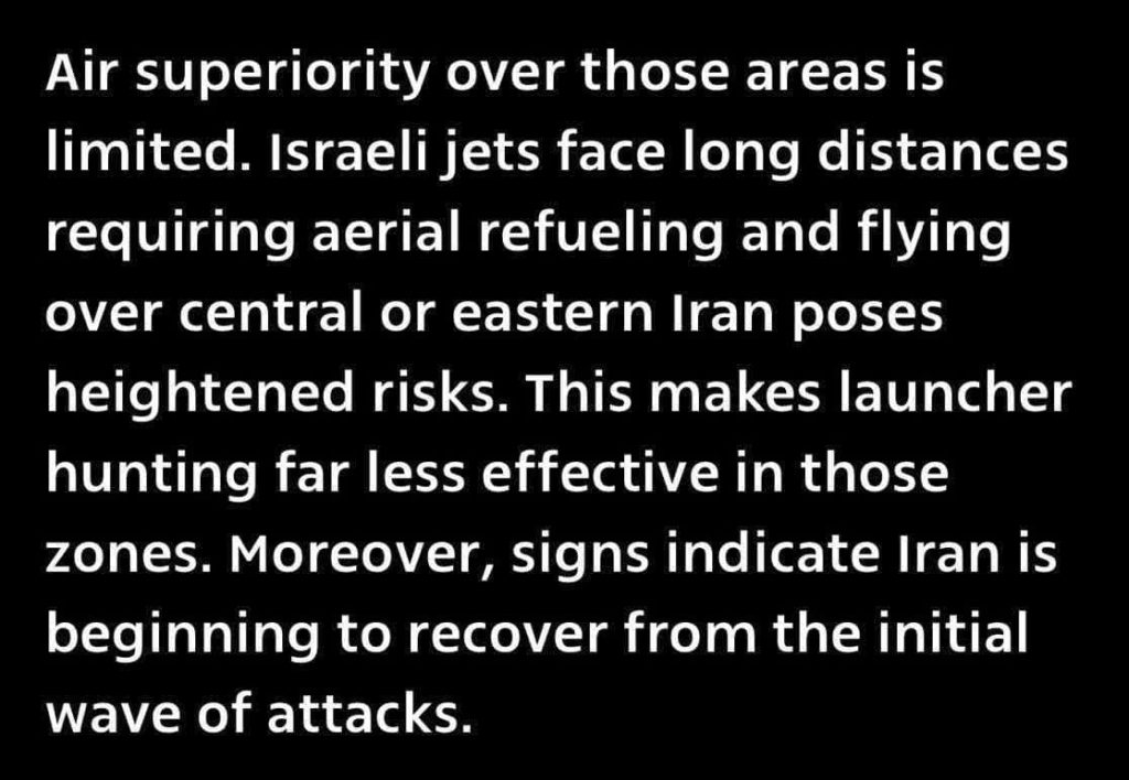 حملات آنها به مناطق مرکزی ایران بسیار محدود و کند هستند و همچنین ادعا میشود که پدافندهای ایرانی در برخی مناطق در حال بازیابی و بهبود هستند.