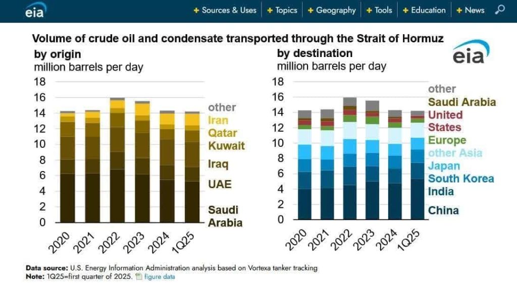 🔹در ماه می سال ۲۰۲۵، روزانه ۲۱.۱ میلیون بشکه نفت و محصولات نفتی از تنگه هرمز عبور کرده که عربستان با سهم ۳۴ درصدی معادل ۷.۲ میلیون بشکه، بیشترین سهم را دارد.
