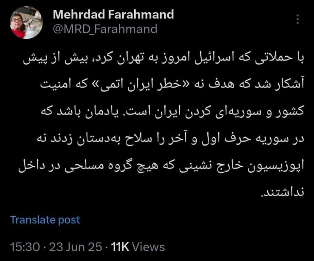 با حملاتی که اسرائیل امروز به تهران کرد، بیش از پیش آشکار شد که هدف نه «خطر ایران اتمی» که امنیت کشور و سوریهای کردن ایران است.