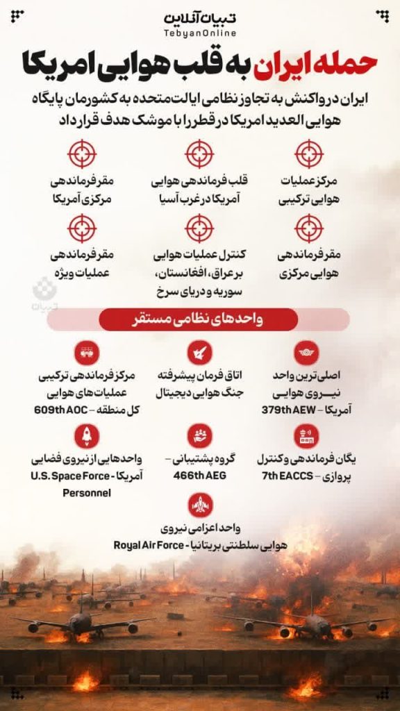ایران در واکنش به تجاوز نظامی ایالتمتحده به کشورمان پایگاه هوایی العدید آمریکا در قطر را با موشک هدف قرار داد.