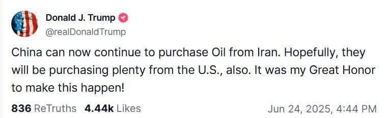 🔹”چین اکنون میتواند به خرید نفت از ایران ادامه دهد. امیدوارم که آنها مقدار زیادی نفت از آمریکا نیز خریداری کنند. این افتخار بزرگی برای من بود که این اتفاق را رقم بزنم”.