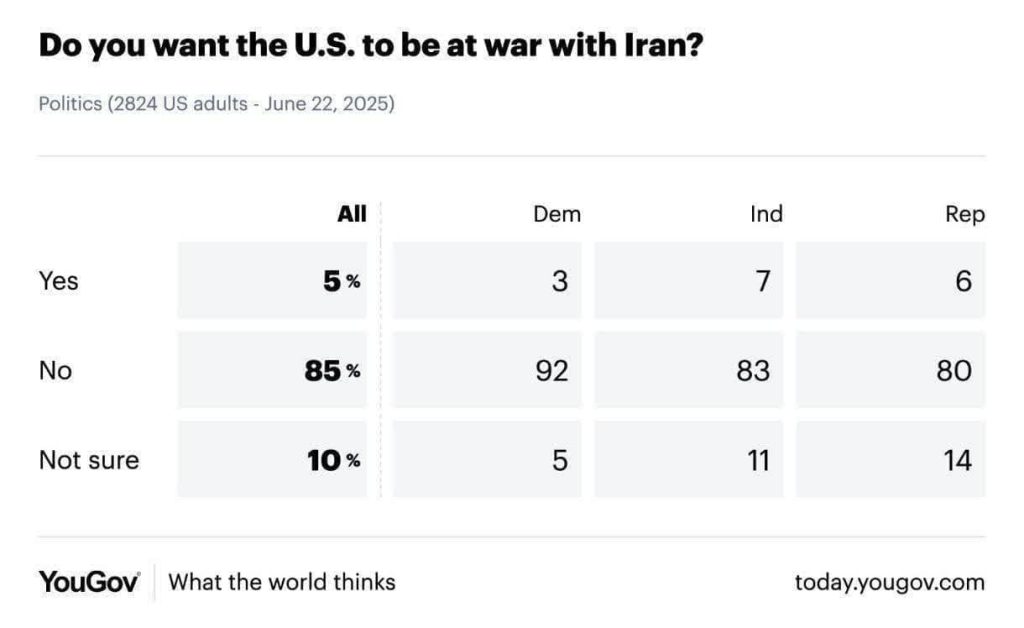 🔹سران آمریکا به وضوح از عواقب جنگ با ایران هراس دارندچرا که طبق نظرسنجی جدید موسسه معتبر YouGov، بیش از ۸۵ درصد مردم این کشور مخالف ورود ایالات متحده به جنگ با ایران بودند.