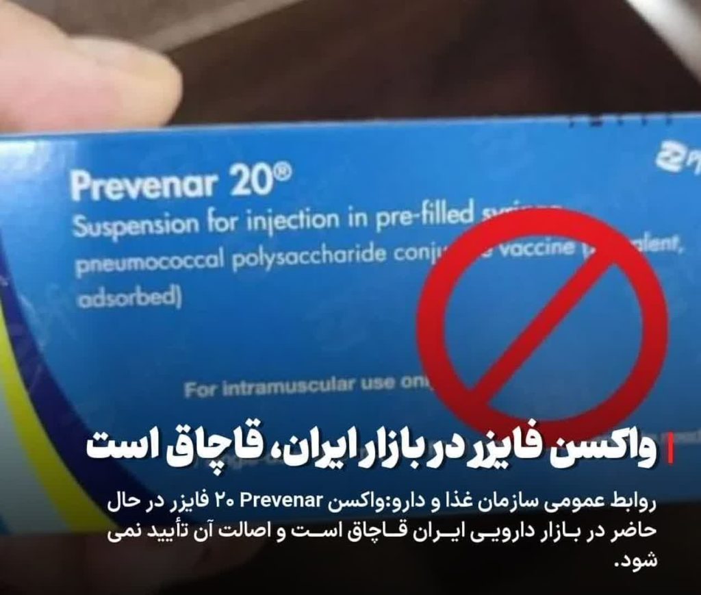 🔹واکسن Prevenar ۲۰ فایزر در حال حاضر در بازار دارویی ایران قاچاق است و اصالت آن تأیید نمیشود.