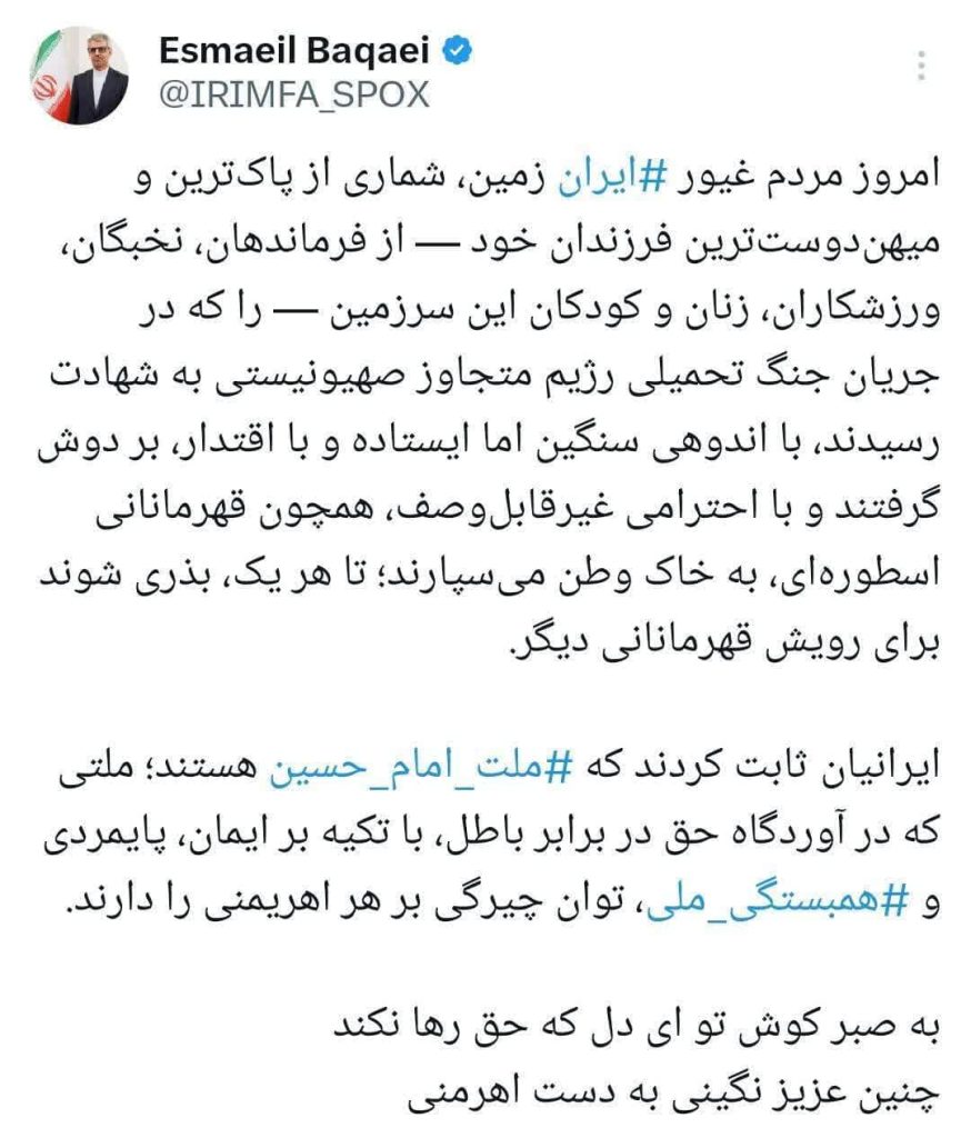 🔹امروز مردم غیور #ایران زمین، شماری از پاکترین و میهندوستترین فرزندان خود — از فرماندهان، نخبگان، ورزشکاران، زنان و کودکان این سرزمین — را که در جریان جنگ تحمیلی رژیم متجاوز صهیونیستی به شهادت رسیدند، با اندوهی سنگین اما ایستاده و با اقتدار، بر دوش گرفتند و با احترامی غیرقابلوصف، همچون قهرمانانی اسطورهای، به خاک وطن میسپارند؛ تا هر یک، بذری شوند برای رویش قهرمانانی دیگر.