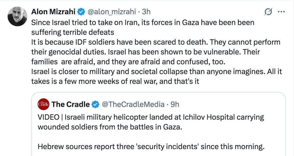 🔹آلون میزراهی: از زمانی که اسرائیل سعی در مقابله با ایران داشت، نیروهایش در غزه شکست های وحشتناکی را متحمل شدهاند. به این دلیل است که سربازان ارتش اسرائیل تا سر حد مرگ ترسیدهاند. آنها نمیتوانند وظایف نسلکشی خود را انجام دهند.