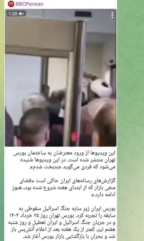 🔹 در ۱۸ تیر، BBC فارسی با انتشار ویدیویی مدعی شد که معترضان وارد ساختمان بورس شدهاند و با پخش صدای «بدبخت شدم» فضای ناامنی و فروپاشی اقتصادی را القا کرد.