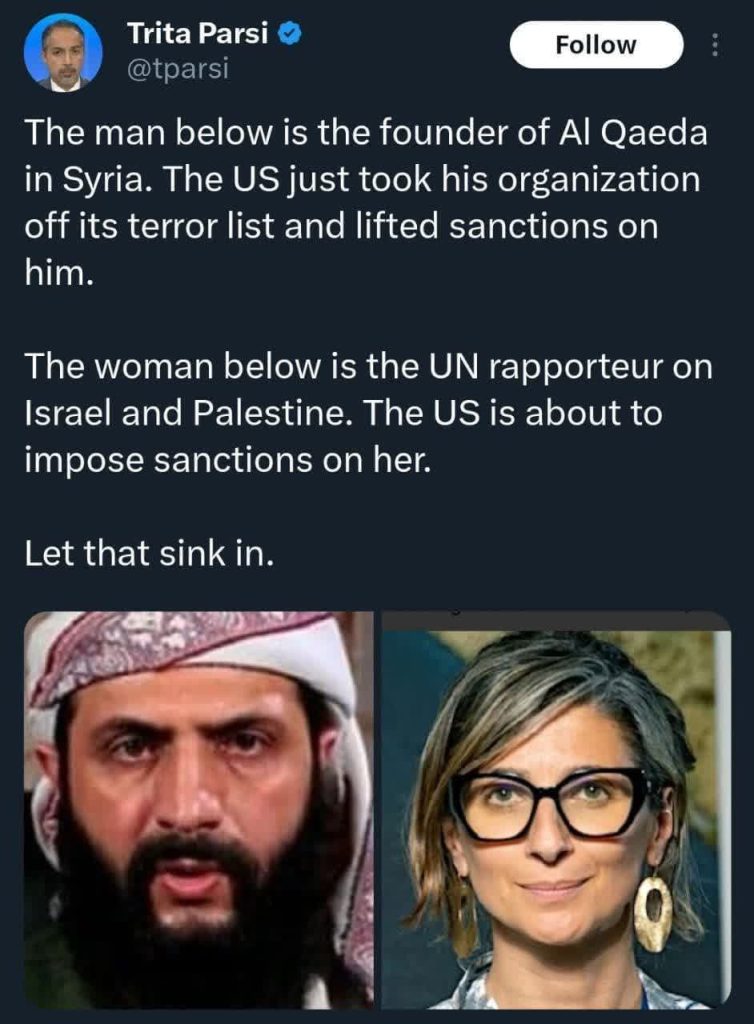🔹 مردی که در تصویر پایین دیده میشود، بنیانگذار القاعده در سوریه است؛ فردی که ایالات متحده اخیراً نام سازمان تحت رهبریاش را از فهرست گروههای تروریستی خارج کرده و تحریمهایش را لغو کرده است.