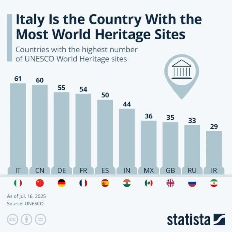 براساس اعلام یونسکو، ایتالیا، چین و آلمان بیشترین تعداد بناهای ثبت شده در فهرست میراث جهانی را دارند و ایران با ۲۹ تعداد ثبت در رتبه دهم این فهرست است.