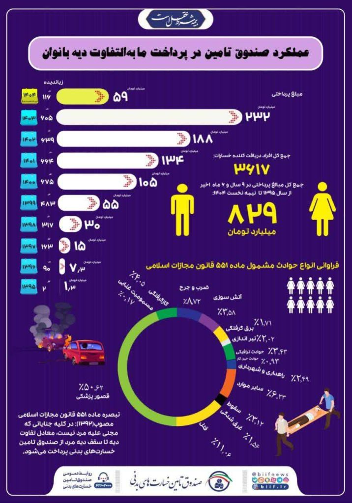 🔹بر اساس وظایف محوله قانونی حمایت از زیاندیدگان و رفع تبعیض بانوان، صندوق تامین خسارتهای بدنی از سال ۱۳۹۵ تا نیمه نخست سال جاری بیش از ۸۲۹ میلیارد تومان برای جبران مابهالتفاوت دیه زنان به ۳۶۱۷ نفر زیاندیده پرداخت کرده است.