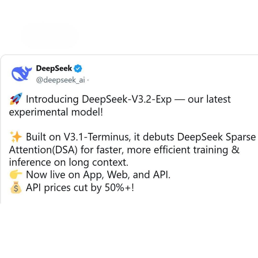 🔹دیپسیک با اعلام انتشار نسخهٔ جدید این مدل هوش مصنوعی چینی نوشت: در این نسخه هزینههای پردازش نسبت به نسخهٔ قبل ۵۰ درصد کاهش یافته و پردازش متنهای طولانی کارآمدتر شده است.