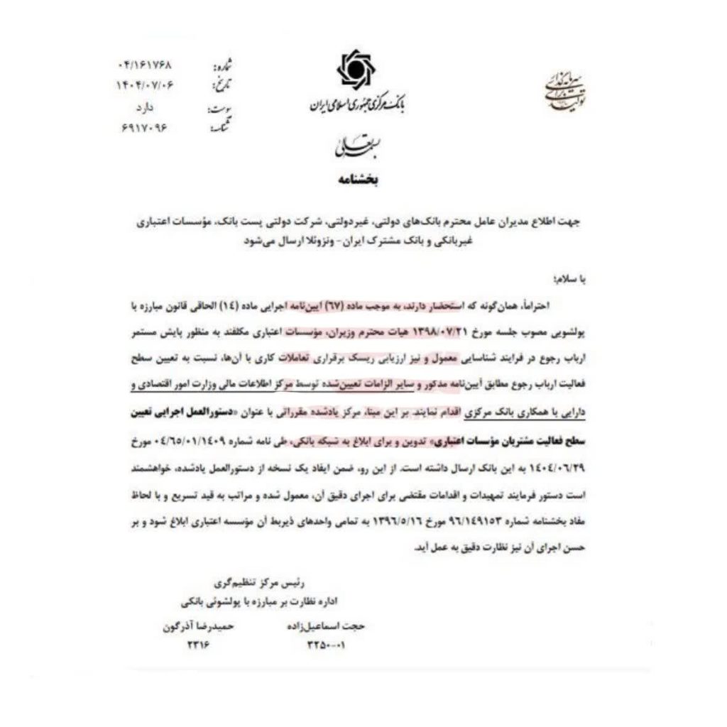 🔹بانک مرکزی همه بانکها را موظف کرد سقف فعالیت سالانه برای هر مشتری تعیین کنند؛ ۲۰۰ میلیارد ریال برای اشخاص حقیقی مزدبگیر، ۵۰ میلیارد ریال برای اشخاص حقیقی فاقد شغل، و ۵ میلیارد ریال برای حقوقیهای غیرفعال.