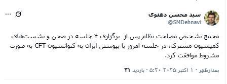 🔹 مجمع تشخیص مصلحت نظام پس از برگزاری ۴ جلسه در صحن و نشستهای کمیسیون مشترک، در جلسه امروز با پیوستن ایران به کنوانسیون CFT به صورت مشروط موافقت کرد.