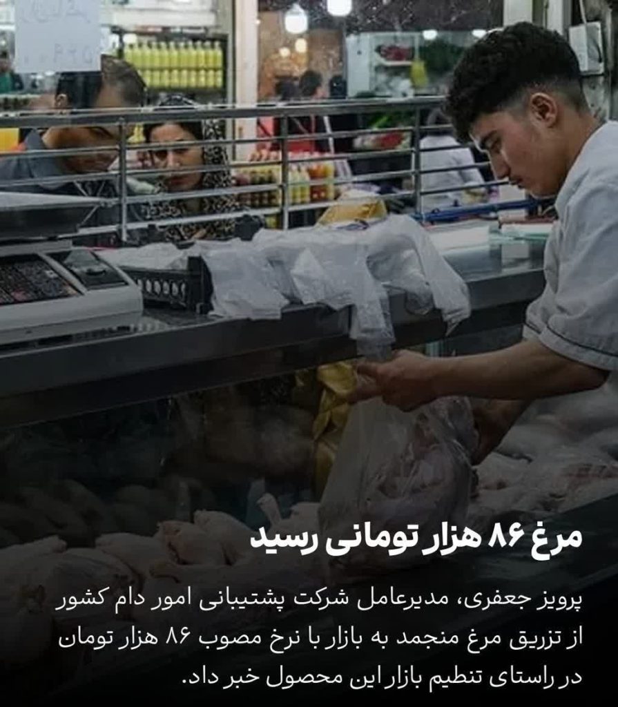 🔹ذخایر گوشت مرغ کافی است و کمبودی در این زمینه نداریم. همچنین مرغ منجمد با نرخ مصوب ۸۶ هزار تومان به بازار تزریق میشود تا بازار این محصول تنظیم شود.