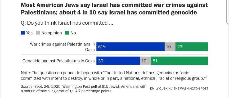 🔹بر اساس نظرسنجی انجام گرفته از سوی روزنامه واشنگتن پست، ۶۱ درصد از یهودیان آمریکایی اعتقاد دارند که رژیم صهیونیستی در غزه مرتکب جنایت جنگی شده است و ۳۹ درصد نیز معتقدند اسرائیل اقدام به نسلکشی در غزه کرده است.