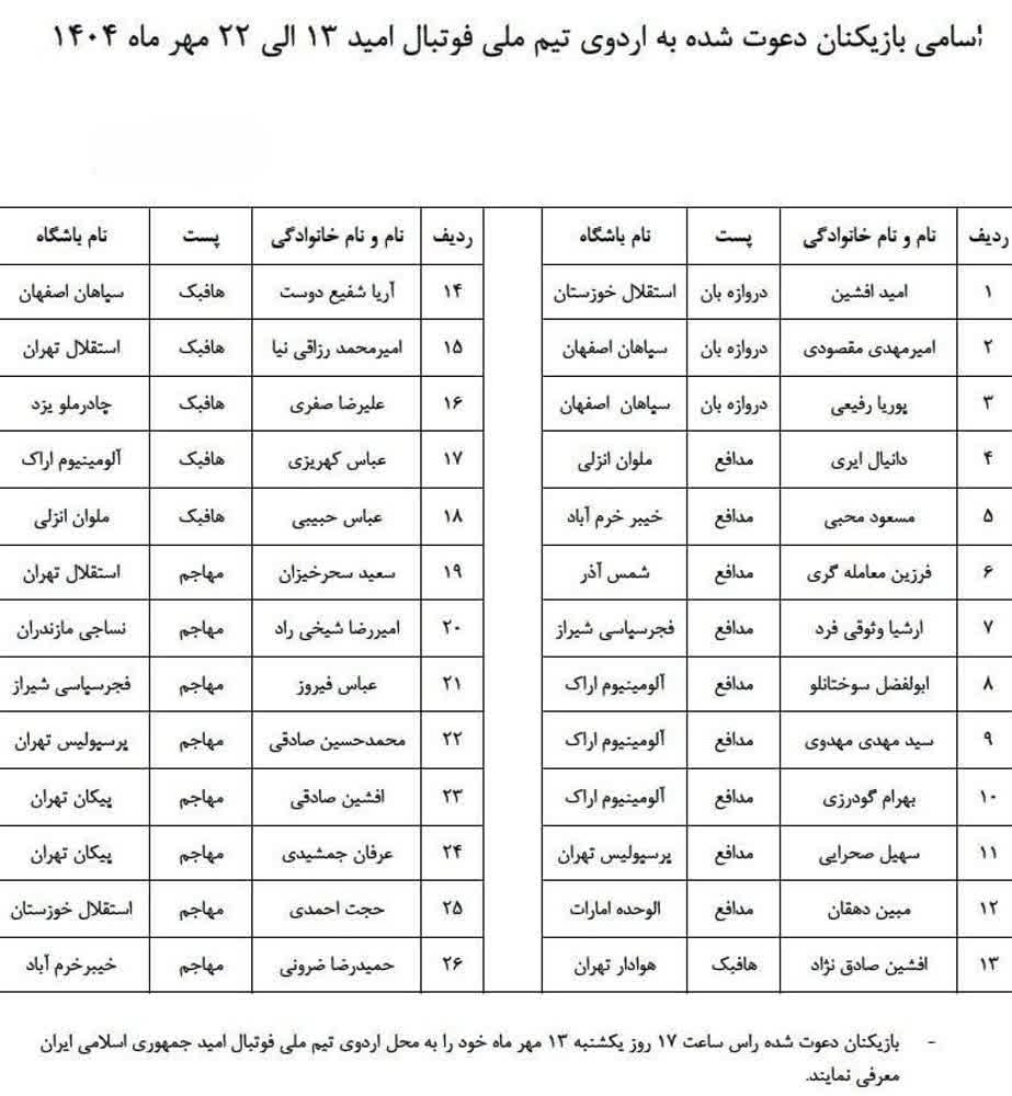 🔹 پوریا لطیفیفر، یادگار رستمی و فرهان جعفری بهخاطر مصدومیت و محمد خلیفه، مهدی زارع، محمدجواد حسیننژاد و کسری طاهری بهدلیل قرار گرفتن در فهرست تیم ملی بزرگسالان، در این اردو حضور ندارند.