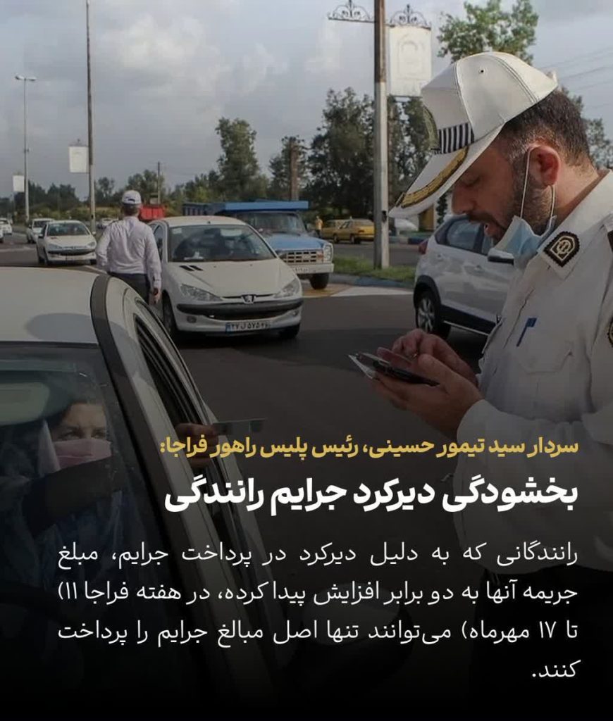 🔹رانندگانی که به دلیل دیرکرد در پرداخت جرایم، مبلغ جریمه آنها به دو برابر افزایش پیدا کرده، در هفته فراجا (۱۱ تا ۱۷ مهرماه) میتوانند تنها اصل مبالغ جرایم را پرداخت کنند.