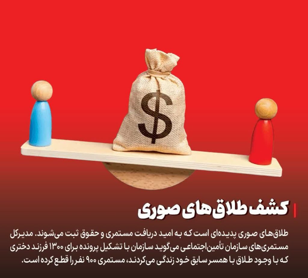 🔹 طلاقهای صوری پدیدهای است که به امید دریافت مستمری و حقوق ثبت میشوند. مدیرکل مستمریهای سازمان تأمیناجتماعی میگوید سازمان با تشکیل پرونده برای ۱۳۰۰ فرزند دختری که با وجود طلاق با همسر سابق خود زندگی میکردند، مستمری ۹۰۰ نفر را قطع کرده است.