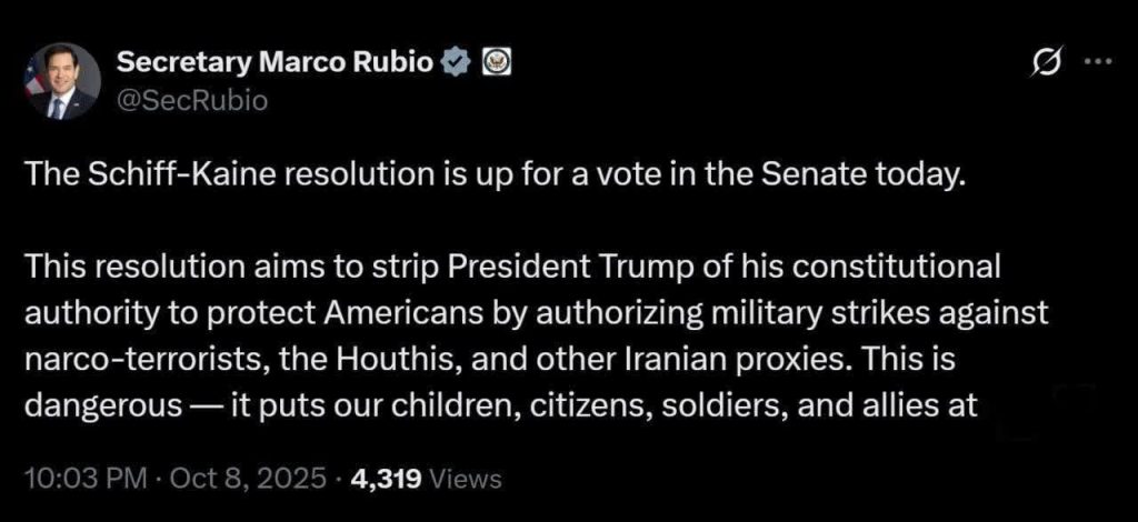 مارکو روبیو، در واکنش به طرح قطعنامه «شیف-کین» که امروز در سنای آمریکا به رأی گذاشته میشود، هشدار داد:
