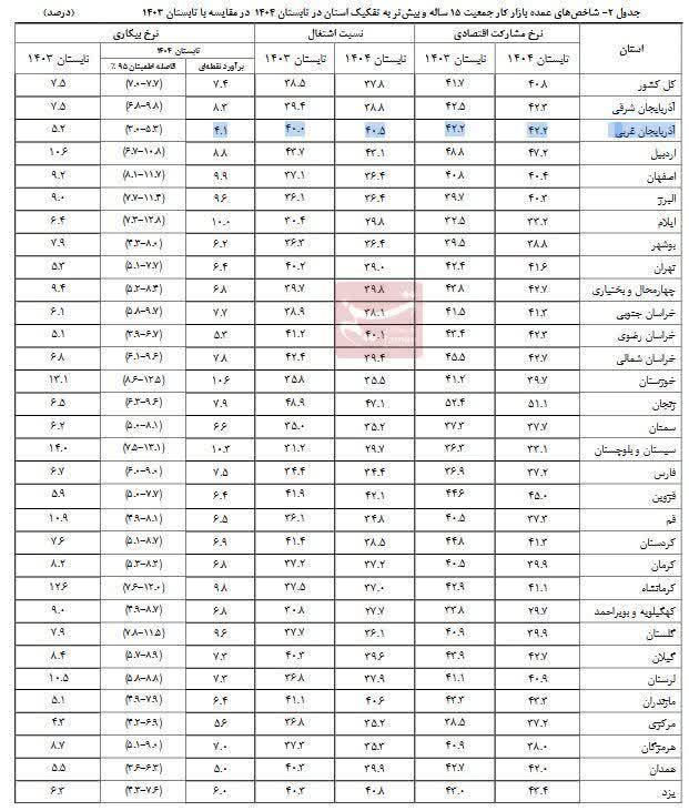 🔹استان آذربایجانی غربی با نرخ بیکاری ۴.۱ درصد و همدان با بیکاری ۵ درصد پایین ترین نرخ بیکاری را دارند.
