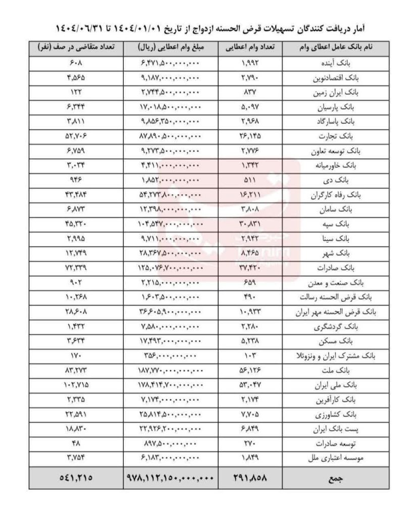 🔹آمار رسمی بانک مرکزی نشان میدهد در ۶ ماهه نخست سال ۱۴۰۴، بیش از ۲۹۱ هزار نفر حدود ۹۸ همت وام ازدواج گرفتند که ۷۵ درصد آن توسط ۶ بانک پرداخت شد