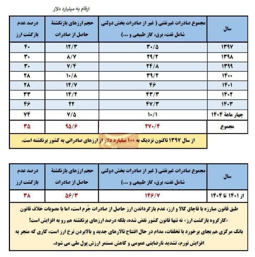 🔹این میزان عدم بازگشت ارز صادراتی شامل بیش از ۳۵ درصد کل صادرات غیرنفتی کشور می شود.