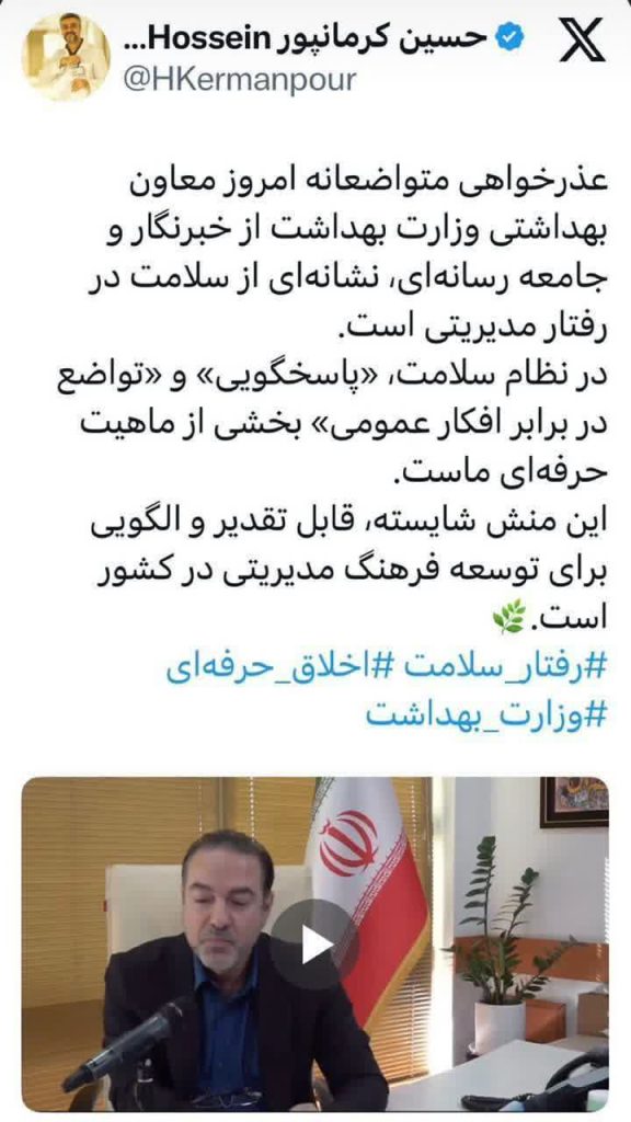 🔹عذرخواهی متواضعانه امروز معاون بهداشتی وزارت بهداشت از خبرنگار و جامعه رسانهای، نشانهای از سلامت در رفتار مدیریتی است.