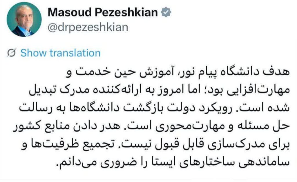 پزشکیان: دانشگاه «پیام نور» به ارائهکننده مدرک تبدیل شده است برجسته نوامبر 17, 2025 Share FacebookTwitterPinterestWhatsApp هدردادن منابع کشور برای مدرکسازی قابلقبول نیست. admin iranma Search Latest articles دریافت نخستین سیگنالهای ۳ ماهوارۀ ایرانی دسامبر 28, 2025 شمار شهدای غزه به ۷۰ هزار و ۹۴۵ نفر رسید دسامبر 26, 2025 بازگشت حسن یزدانی به اردوی تیم ملی کشتی آزاد دسامبر 26, 2025 ردِ خونِ دانشمندان مصری بر دستان اسرائیل دسامبر 26, 2025 Previous articleخلع ید ۲۲۰۰ هکتار از اراضی ملی مازندرانNext articleآسیب به هزار و ۹۴۷ دستگاه خودرو در جنگ تحمیلی رژیم صهیونیستی/ خسارات برآورد شده خودروها هزار و ۱۰۰ میلیارد تومان است Related articles شمار شهدای غزه به ۷۰ هزار و ۹۴۵ نفر رسید برجسته دسامبر 26, 2025 بازگشت حسن یزدانی به اردوی تیم ملی کشتی آزاد برجسته دسامبر 26, 2025 ردِ خونِ دانشمندان مصری بر دستان اسرائیل برجسته دسامبر 26, 2025 Leave a reply Cancel reply Comment: Please enter your comment! Name:* Please enter your name here Email:* You have entered an incorrect email address! Please enter your email address here Website: Save my name, email, and website in this browser for the next time I comment.