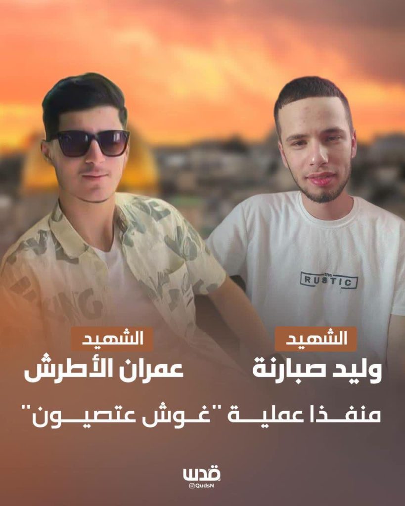 وزارت بهداشت فلسطین از شهادت ولید صبارنه و عمران الاطرش، دو مجری عملیات شهادتطلبانه در جنوب بیتلحم بر اثر تیراندازی مزدوران رژیم صهیونیستی خبر داد.