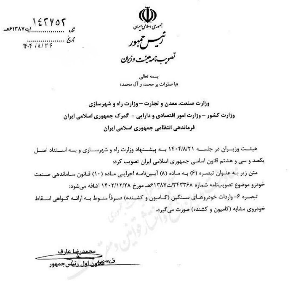 🔹با مصوبۀ هیئت وزیران واردات خودروهای سنگین ازاینپس تنها درصورت ارائۀ گواهی اسقاط خودروی مشابه مجاز خواهد بود.