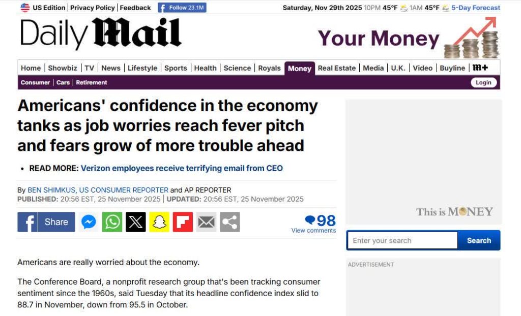 🔹 خریداران آمریکایی فکر میکنند اوضاع بهسرعت رو به وخامت است. تعطیلی رکوردشکن دولت، تورم چسبنده و موج اخیر اخراجها توسط شرکتهای بزرگ، همگی دستبهدست هم دادهاند تا مصرفکنندگان آمریکایی احساس ناخوشایندی داشته باشند.