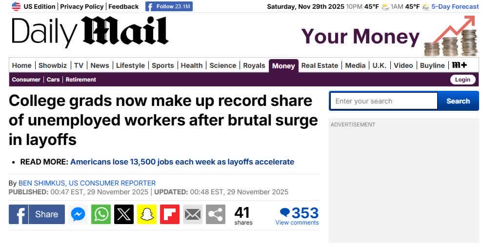 🔹 دادههای تازه اداره آمار کار آمریکا نشان میدهد فارغالتحصیلان دانشگاهی اکنون بیشترین سهم را در میان بیکاران دارند؛ روندی که همزمان با موج شدید اخراجها در شرکتهای بزرگ و بخش فناوری شدت گرفته است.