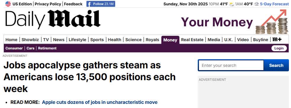 🔹 ردیاب تعدیل نیروِ شرکت Challenger, Gray & Christmas گزارش داده که فقط در ماه اکتبر بیش از ۱۵۳ هزار نفر اخراج شدهاند؛ رقمی که نسبت به سال گذشته جهشی خیرهکننده، معادل ۱۷۵ درصد، داشته است.