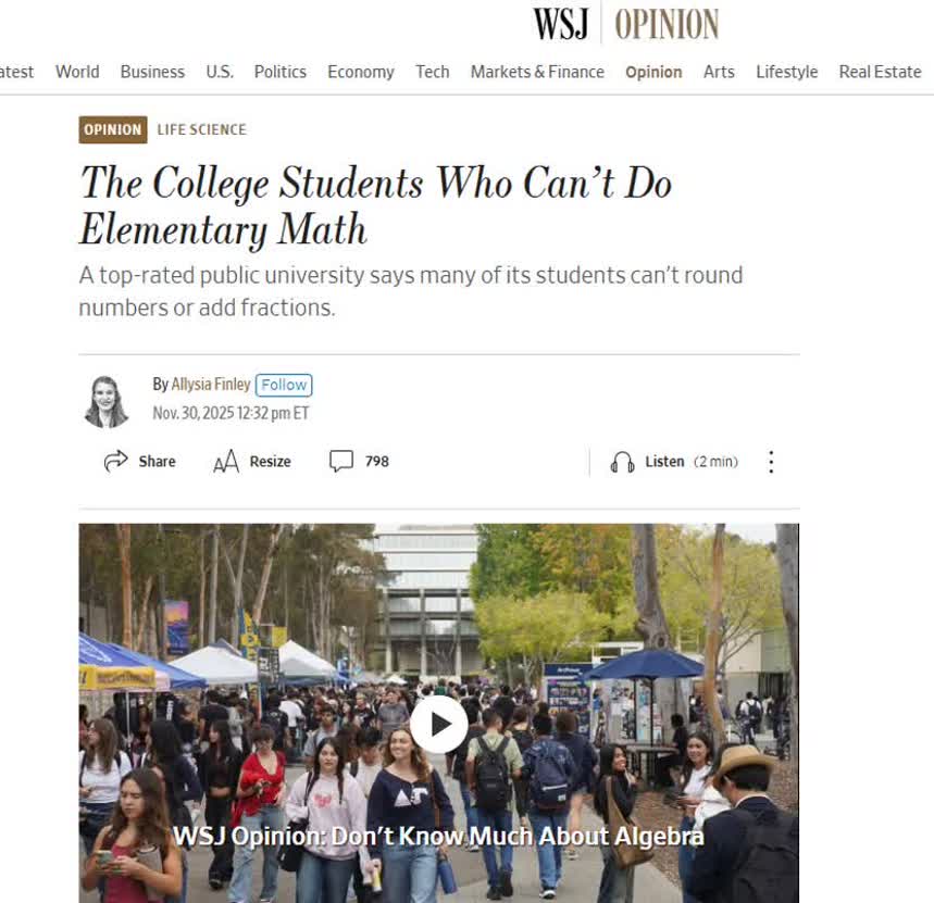 🔹 کودکان در دبستان یاد میگیرند که کسرها را جمع کنند و اعداد را گرد کنند. اما طبق یک تحلیل جدید از دانشگاه کالیفرنیا در سندیگو ـ دانشگاهی دولتی و معتبر که در رتبهبندی نشریه U.S. News & World Report جایگاه ششم را دارد ـ بسیاری از دانشجویان از انجام همین کارهای پایهای عاجزند. بخوانید و برای آیندهٔ آمریکا تأسف بخورید