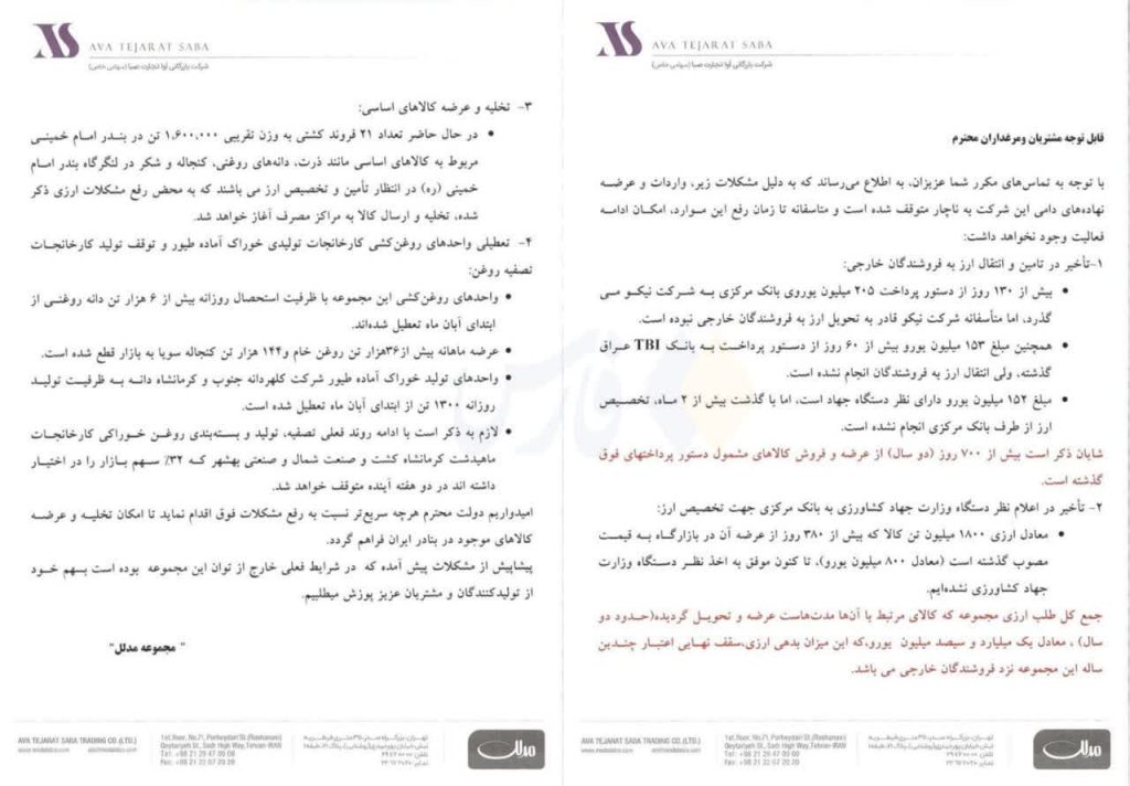 🔹وارادات و عرضه نهادههای دامی «به ناچار» متوقف شده و تا زمان رفع مشکلات امکان ادامه فعالیت وجود ندارد. این بخشی از نامه مجموعه مدلل خطاب به مشتریان و مرغداران است.