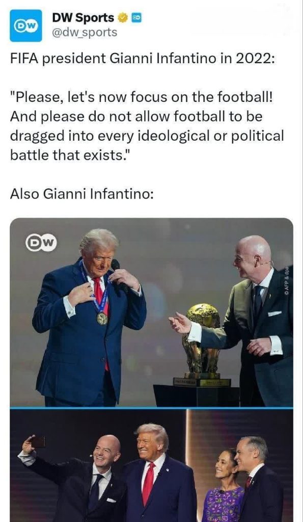 🔹دویچهوله در توئیت اخیر خود این سخنان را کنار رفتاری قرار داده که شامگاه گذشته از رئیس فیفا سر زد؛ جایی که اینفانتینو در جریان مراسم قرعهکشی جام جهانی ۲۰۲۶، مدال صلح به دونالد ترامپ اهدا کرد! اقدامی که در تضاد مستقیم با ادعاهای پیشین رئیس فیفا درباره دور نگه داشتن فوتبال از سیاست است.