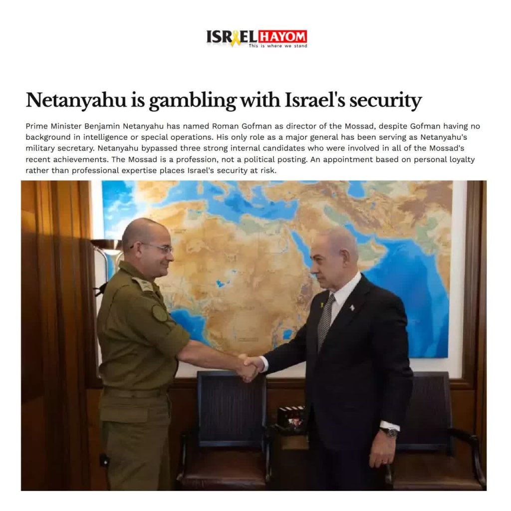 🔹️نخستوزیر «رومن گافمن» را به عنوان مدیر موساد منصوب کرده است؛ حال آنکه گافمن هیچ سابقهای در اطلاعات یا عملیات ویژه ندارد. تنها نقش او خدمت به عنوان دبیر نظامی نتانیاهو بوده است.