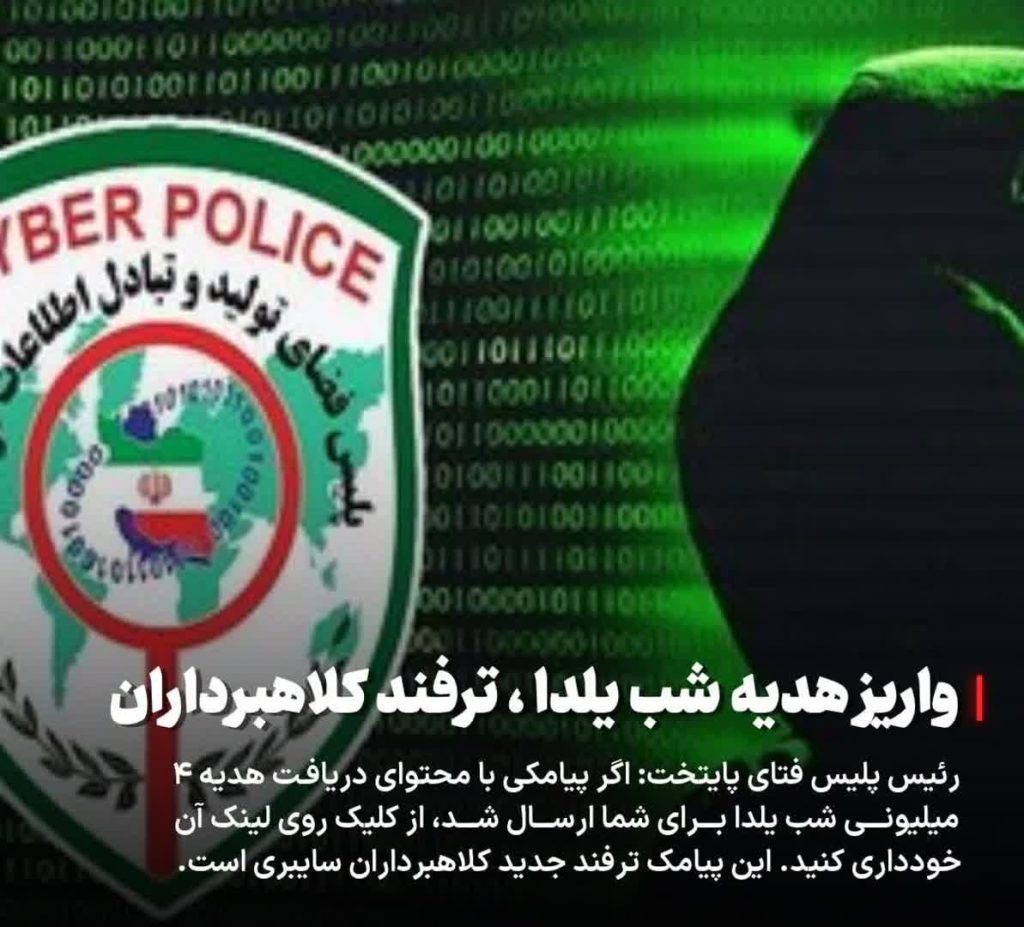 🔹اگر پیامکی با محتوای دریافت هدیه ۴ میلیونی شب یلدا برای شما ارسال شد، از کلیک روی لینک آن خودداری کنید.