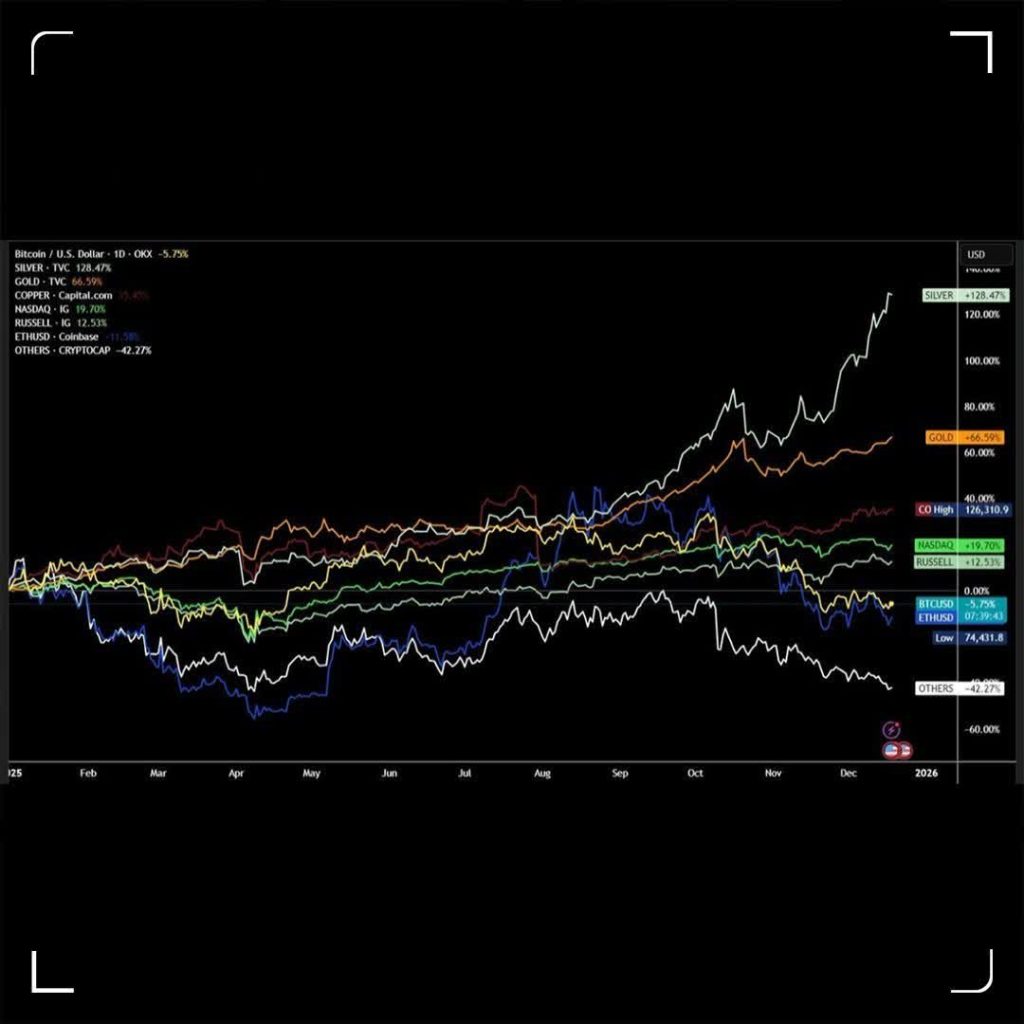 عملکرد بازارها نشان میدهد که در سال ۲۰۲۵، نقره با ۱۴۰٪ و طلا با ۶۵٪ رشد، بازارهای جهانی را تسخیر کردند؛ درحالیکه رمزارزها ضعیفترین عملکرد سال را به نام خود ثبت کردند.