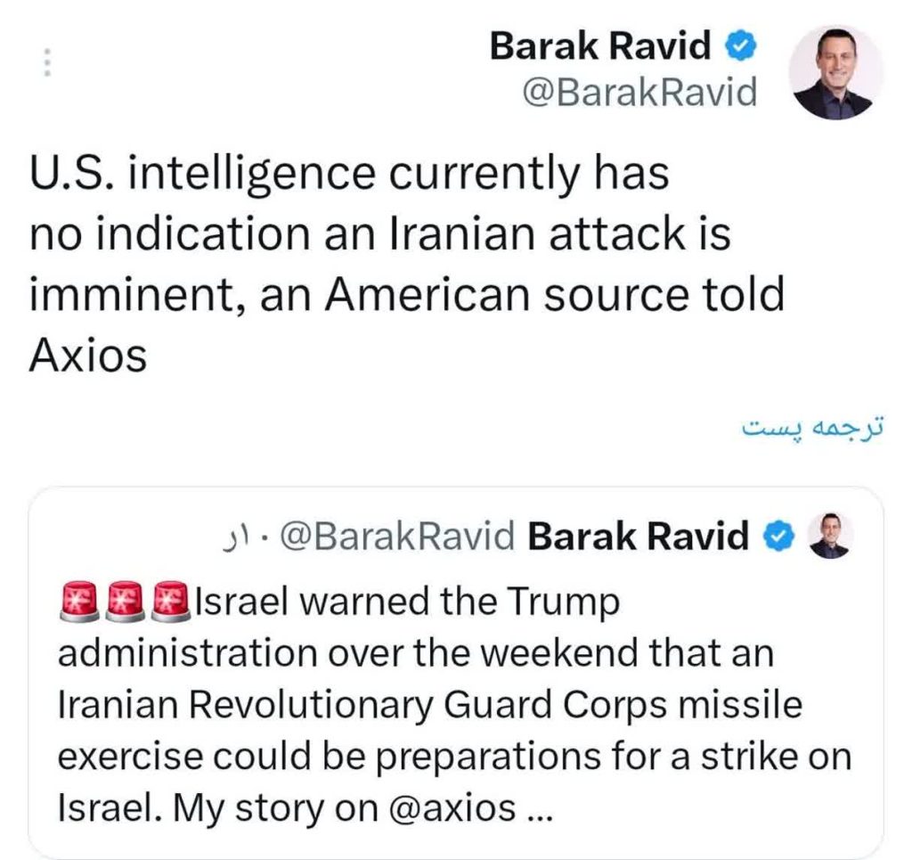🔹منابع اطلاعاتی آمریکا اما میگویند هیچ نشانهای از قریبالوقوع بودن حمله ایران وجود ندارد.