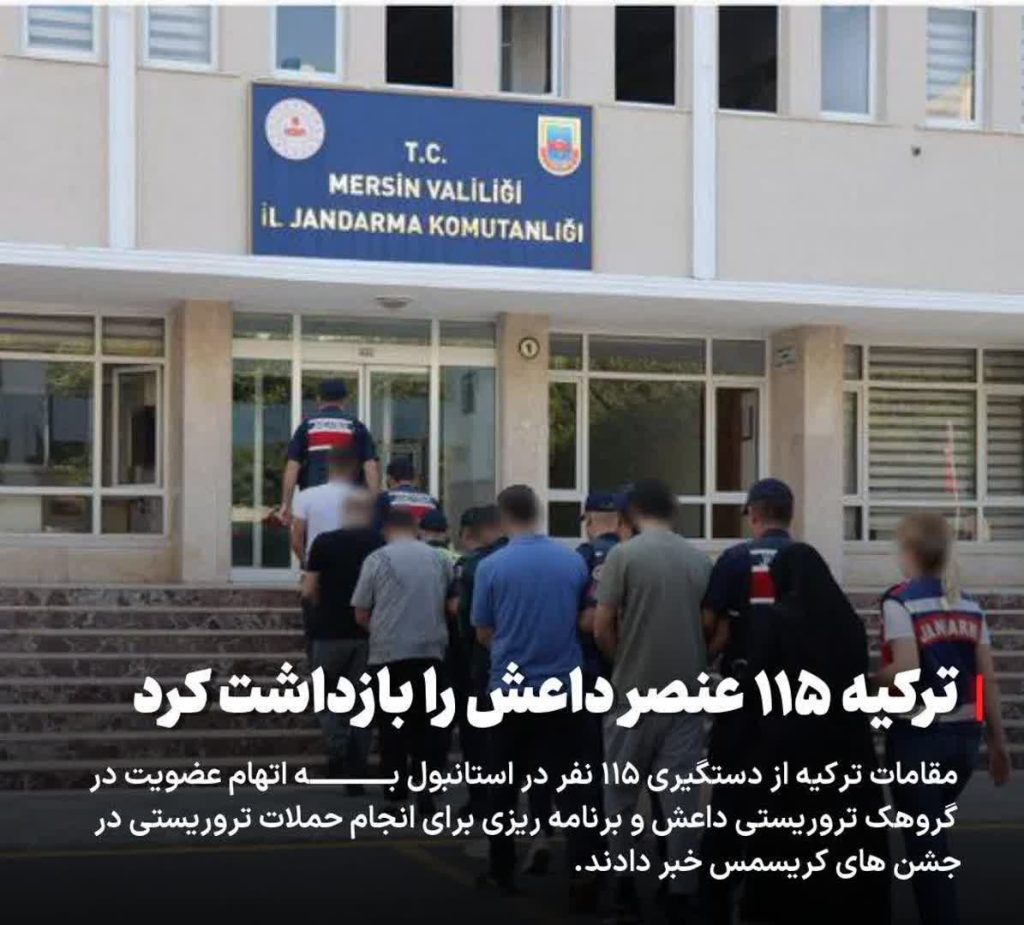 🔹 مقامات ترکیه از دستگیری ۱۱۵ نفر در استانبول به اتهام عضویت در گروهک تروریستی داعش و برنامهریزی برای انجام حملات تروریستی در جشنهای کریسمس خبر دادند