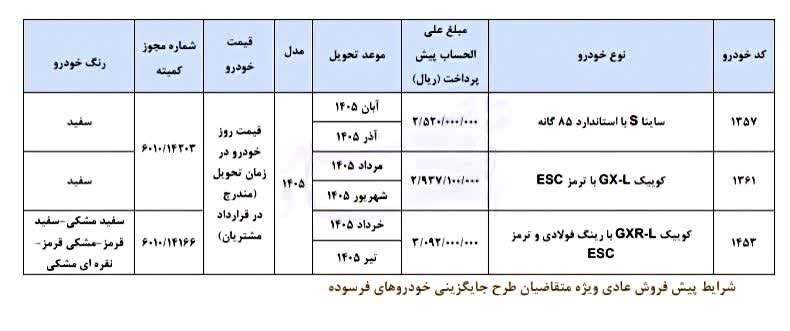 🔹در این طرح فروش خودروهای ساینا s با استاندارد ۸۵ گانه با موعد تحویل آبان تا آذر ماه ۱۴۰۵؛ کوئیک GX-L با ترمز ESC با موعد تحویل مرداد تا شهریور ماه ۱۴۰۵ و کوئیک GXR_ L با رینگ فولادی و ترمز ESC با موعد تحویل تیر ماه ۱۴۰۵ عرضه خواهد شد.