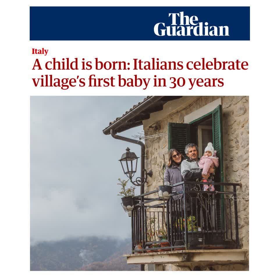 🔹در روستای «پالیارا دی مارسی» تعداد گربهها به مراتب بیشتر از جمعیت مردم روستا است. اما حالا یک اتفاق نادر در این روستا رخ داده است: تولد یک کودک. او اولین نوزادی است که پس از ۳۰ سال در این روستا متولد شده و جمعیت روستا را به حدود ۲۰ نفر رسانده است. ورودش به روستا نمادی از امید است و همچنین یادآوری تکاندهندهای از بحران جمعیت ایتالیا که رو به وخامت گراییده است.